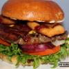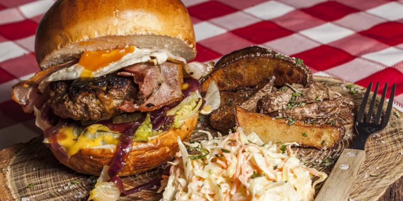 Burger wołowy, ser Cheddar, domowy sos bbq, bekon, krążki cebulowe, coleslaw